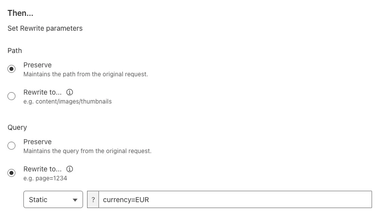 Cloudflare has added a very nifty feature called transform rules that allow you to change URLs based on a number of variables. One of them is the country that people are visiting your site from. So, I created a transform rule that adds ?currency=EUR to every URL on the site for visitors from the EU (and GB). Here’s the “request match” part of that rule: